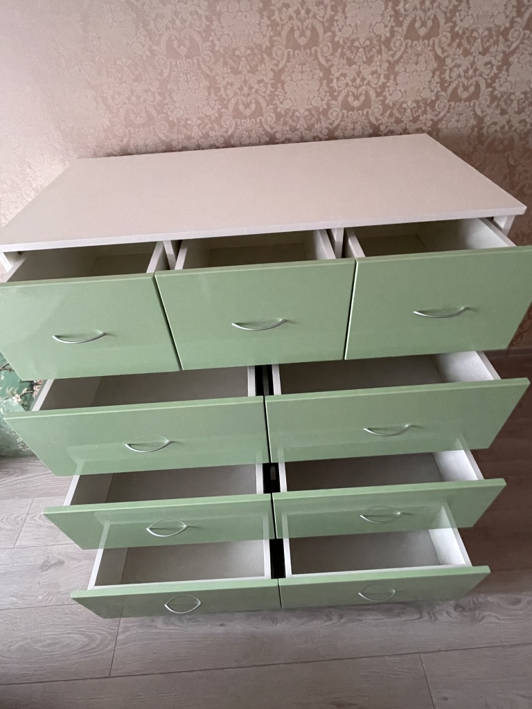Собрали комод, который сами для себя придумали на основе имеющихся образцов с 9-ю выдвижными ящиками. Фасады с фрезеровкой выполнены и подогнаны очень хорошо. Рисунок был сложный, но все совпало и получилось очень красиво. Отдельное спасибо за нижнюю планку фасада на цоколь- получился единый рисунок и современный внешний вид. Есть замечания по глубине ящиков, т.к. в собранном виде ящики не доходят до задней стенке на 6 см. Как-то этот момент не согласовали. Думаю, сто можно было на 5 см точно увеличить глубину ящиков, что было бы функциональнее, т.к. комод это не только фасад, но и шкаф для вещей, постельного белья и Эти 5см я учитывала при выборе размера комода. Если проблема в фурнитуре, то можно было это обсудить. А так, нам теперь с этим жить. Ещё сборка тоже в некоторых местах не продумана ( центральные внутренние отверстия под симметричные направляющие почему-то одно сквозное. Получается, что направляющие с одной стороны прикрутили, а потом с другой стороны центральной стойки в те же отверстия нужно прикручивать с другой стороны направляющие. Шурупы ломаются друг о друга и конструкция кривая. Пришлось подгонять самим. Не хватило 2-х больших шурупов для сборки корпуса. Думаю, что лучше больше класть, чем меньше. Это уже 2-й наш большой заказ. В любом случае большое спасибо, что Вы воплощает наши мечты! Отдельное огромное спасибо инженеру-конструктору и мастеру по внешнему виду фрезеровки. Получилось ОГОНЬ!