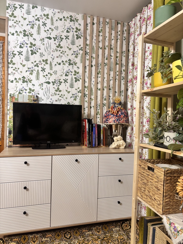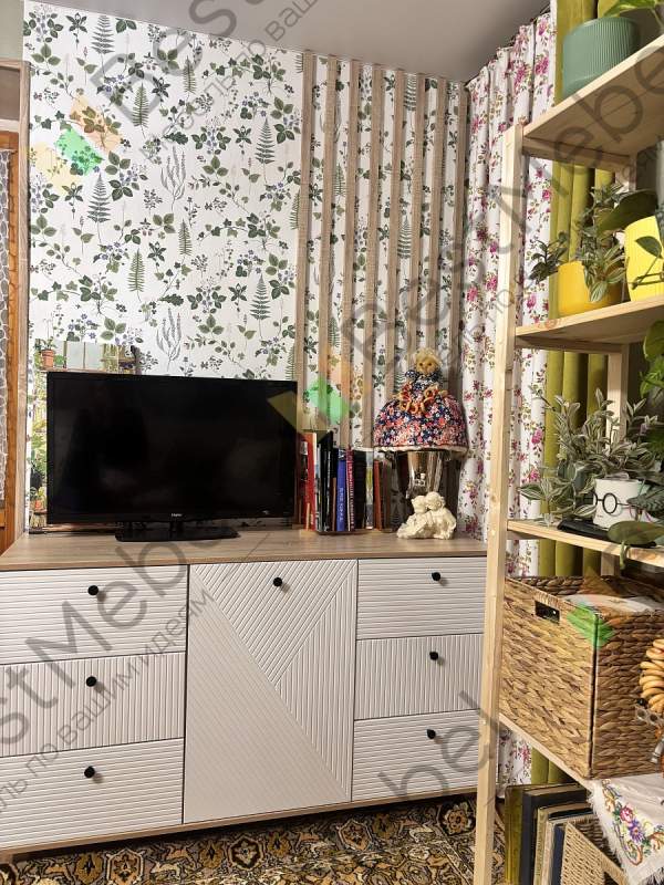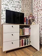 Комод очень понравился. Искали максимально длинный комод, во всю стену и чтобы подошел к интерьеру. Заменили одну полку в центральном отделении на три (добавили две дополнительные). Удобно, что у модели есть ножки и можно выбрать их высоту, чтобы прошел робот-пылесос. Сделан качественно, хорошие материалы, фрезировка фасадов выглядит отлично. Заказ 00000183333