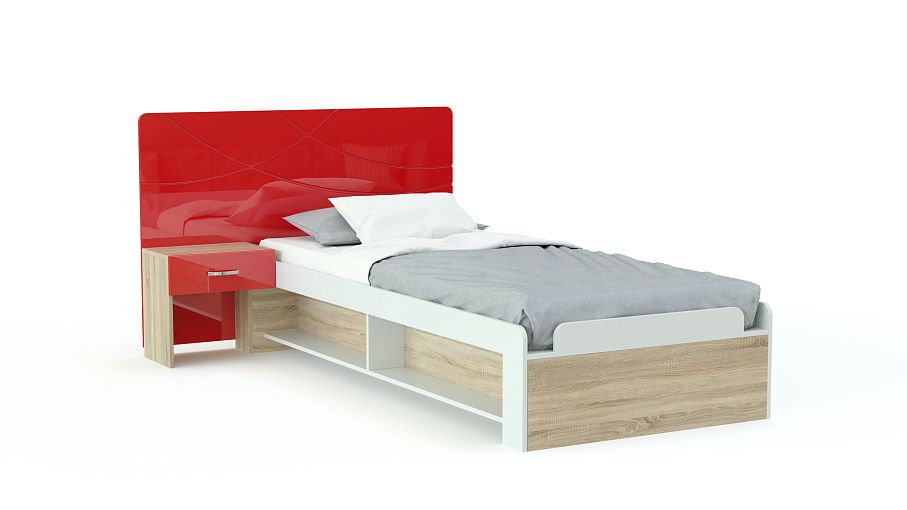 Детская кровать F-L-20 BMS изумляет своим лаконичным продуманным дизайном и практичностью! Комфортное спальное место (90 х 190 см) с основанием из ЛДСП оборудовано небольшими бортиками. Высокое изголовье со скругленными углами сделано из МДФ, оснащено маленькой полкой, где ребенок с легкостью расположит нужное. В конструкцию удачно вписана тумба с одним выдвижным ящиком для личных вещей. Сбоку модели две открытые ниши – здесь можно расставить книги. Цветовая гамма фасадов – красная, глянцевая поверхность. Есть матовые варианты.