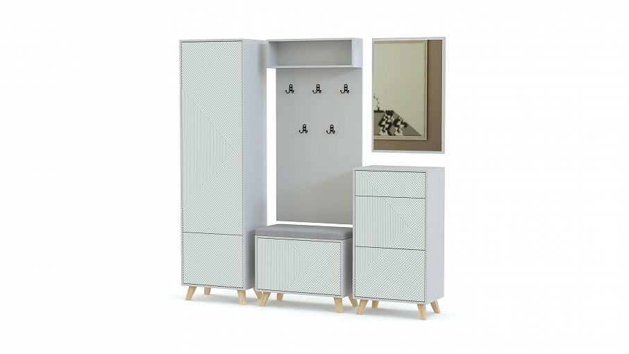 Прихожая Дастин 14.3 BMS в трендовых оттенках с современной фрезеровкой отличается модным минимализмом и функциональностью. В составе модульной композиции пенал, высокая тумба и обувница, открытая вешалка с кубической верхней полкой и навесное зеркало. Скошенные деревянные ножки визуально облегчают интерьер и обеспечивают удобный доступ для уборки, а 3D фрезеровка играет роль стильного акцента. Купить прихожую Дастин 14.3 BMS вы сможете в нашем интернет-магазине с выбором цвета по каталогу.