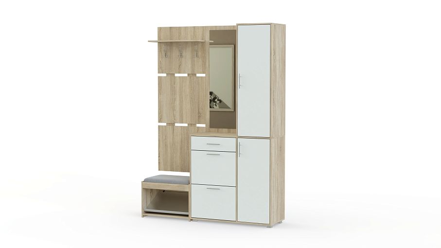Прихожая Инарио BMS отличается компактными размерами и отличной функциональностью. Отдельные модули позволяют Вам менять порядок и использовать элементы по отдельности. Настенная панель с крючками оснащена полочкой для шляп и аксессуаров. Полка под обувь представляет собой гибрид с банкеткой, на неё удобно присесть, снять уличные ботинки и поставить их на подставку. Модуль с зеркалом и шкафчиками может быть исполнен в зеркальном отражении. Нижняя часть элемента представляет собой обувницу с откидными дверцами. Купить прихожую Инарио BMS по низкой цене ив отличном качестве можно в нашем онлайн-магазине.