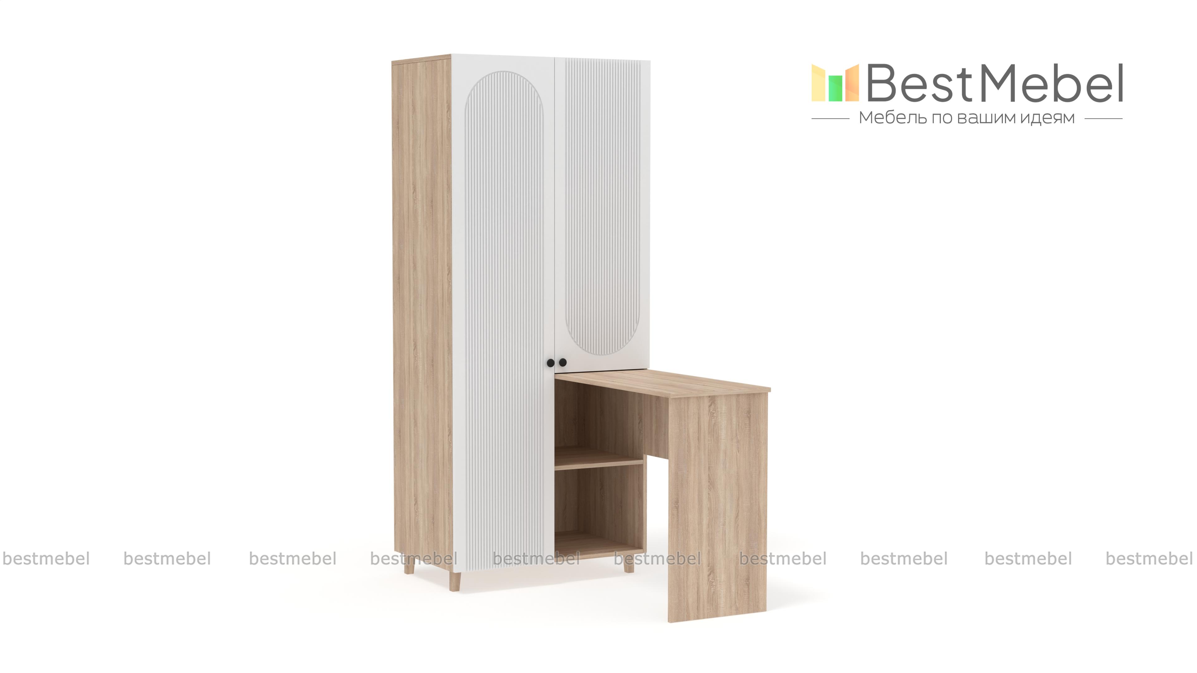 Шкаф со столом Рене 5 BMS обеспечит значительную экономию пространства в небольшой квартире или студии. Конструкция с распашными отделениями и открытыми полками позволяет разместить как одежду, так и материалы для работы или учебы. Письменный столик прямоугольной формы располагается под углом к стильному двухдверному шкафу с рельефным фасадом. Купить шкаф со столом Рене 5 BMS вы сможете на сайте нашего интернет-магазина с изготовлением по индивидуальным размерам.