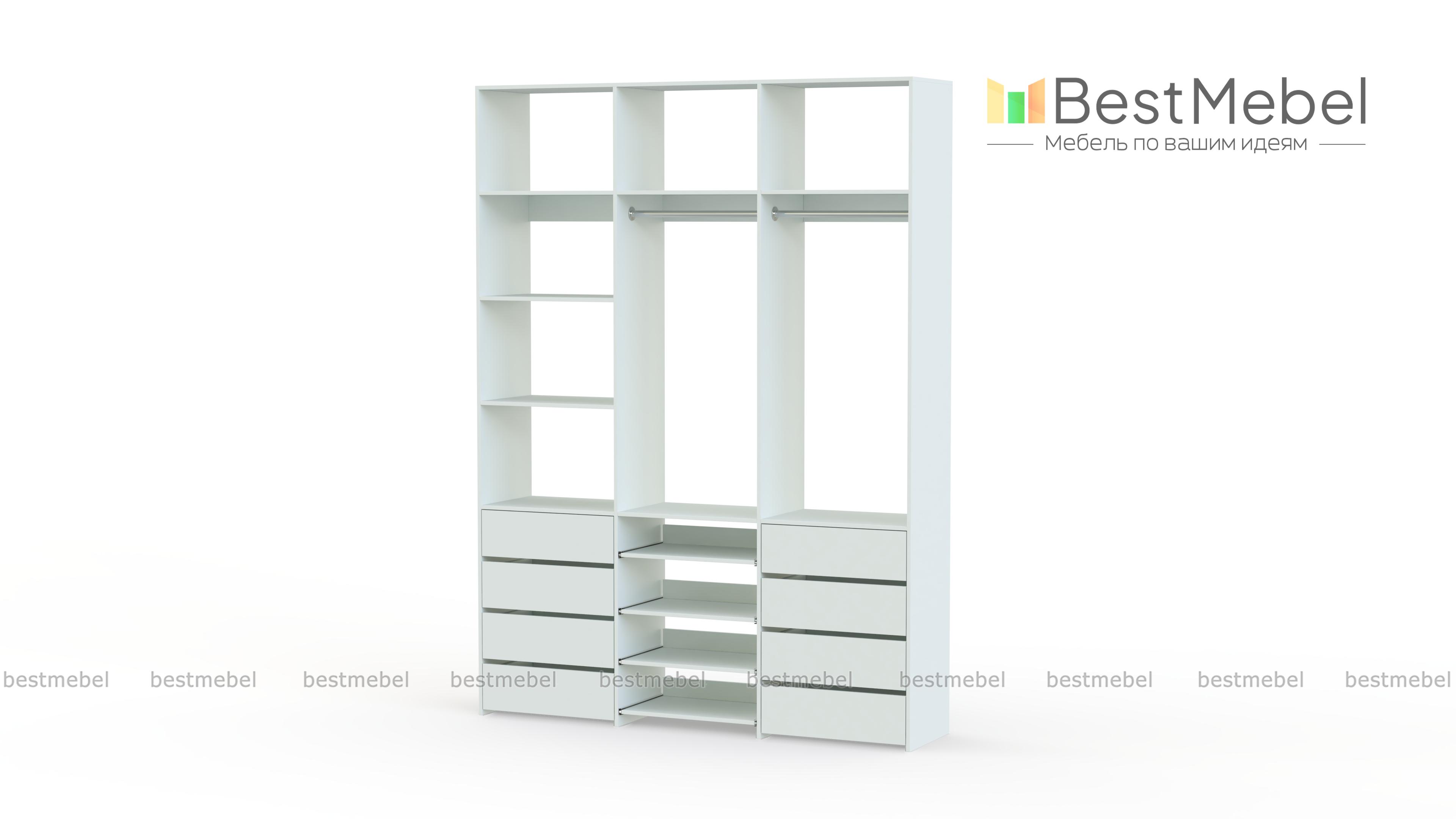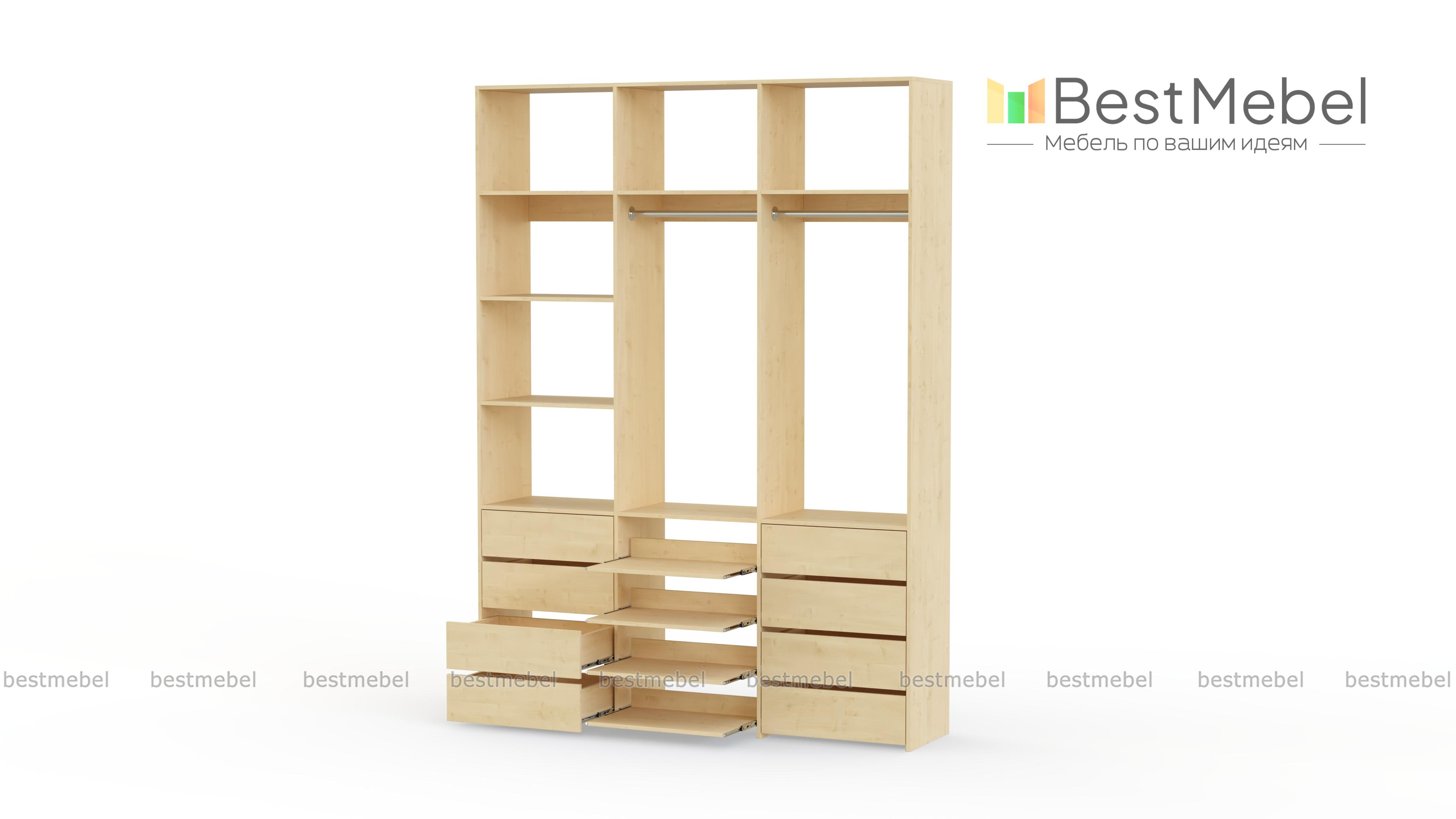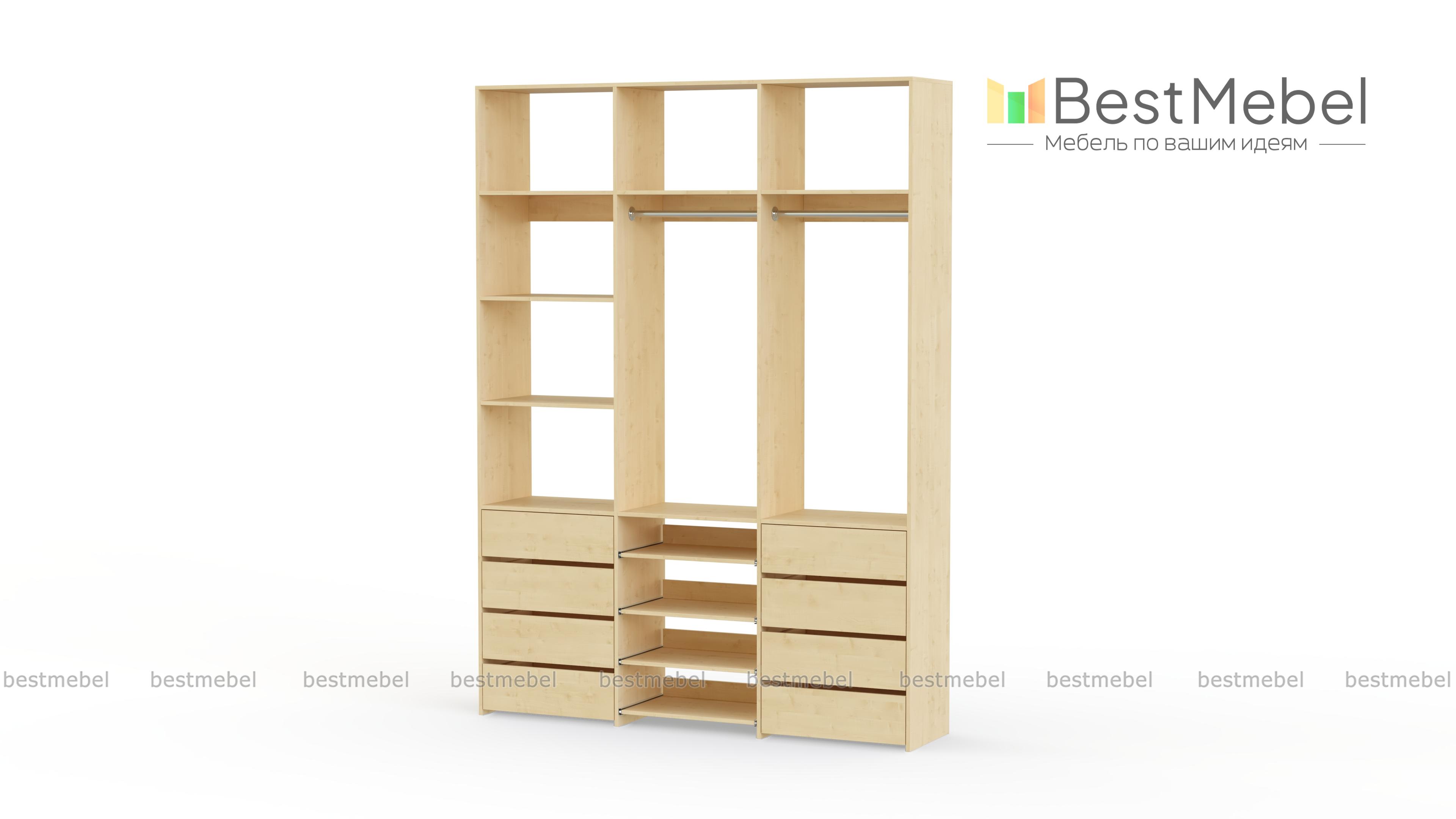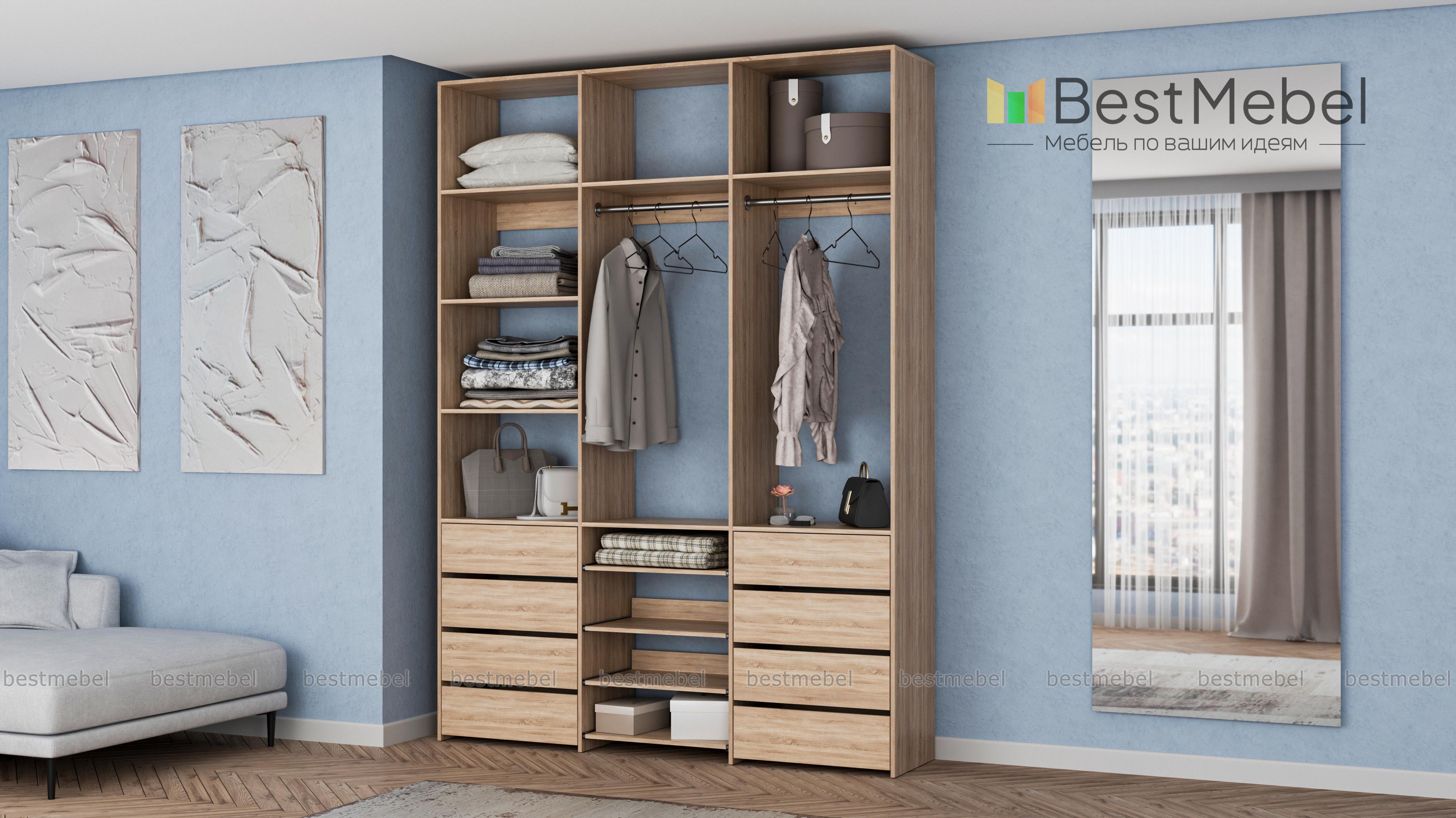 Стеллаж для одежды Мирта 97 BMS имеет открытую конструкцию и облегчит доступ к вещам. Две секции со штангами дополнены просторными полками для сложенных вещей и коробок, а в нижней части располагаются два ряда ящиков для белья и мелочей и выдвижные панели. Нейтральный древесный оттенок подходит почти к любому интерьеру, а ламинированная плита обладает прочностью и долговечностью. Купить стеллаж для одежды Мирта 97 BMS, изготовленный по вашим размерам, приглашаем в наш интернет-магазин.