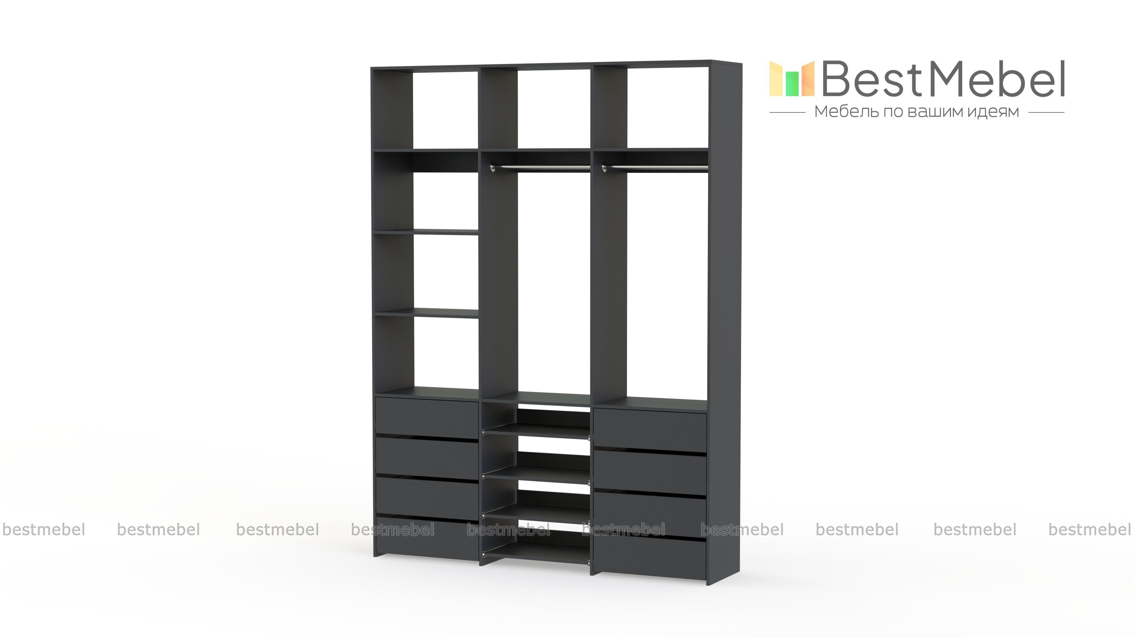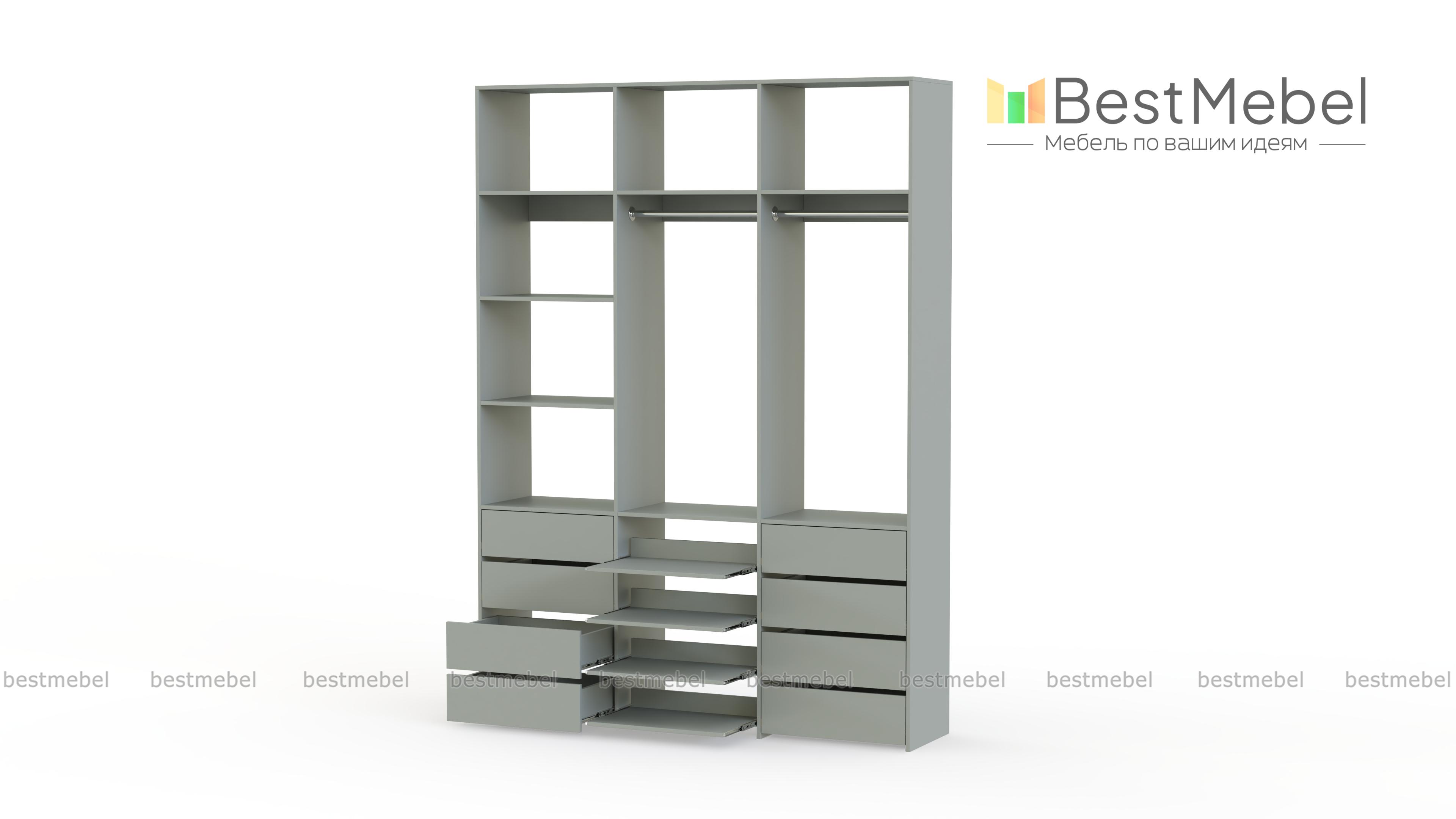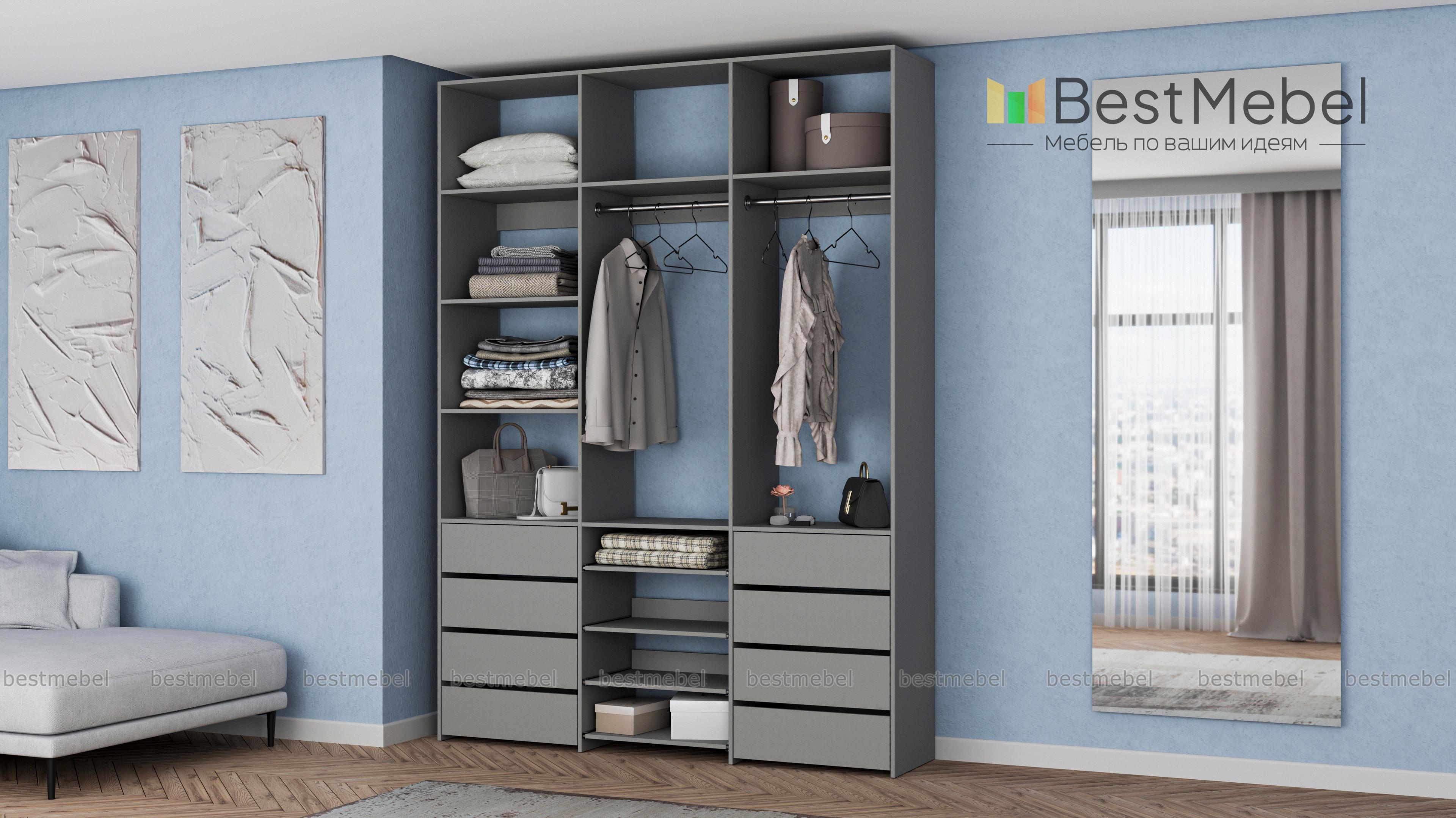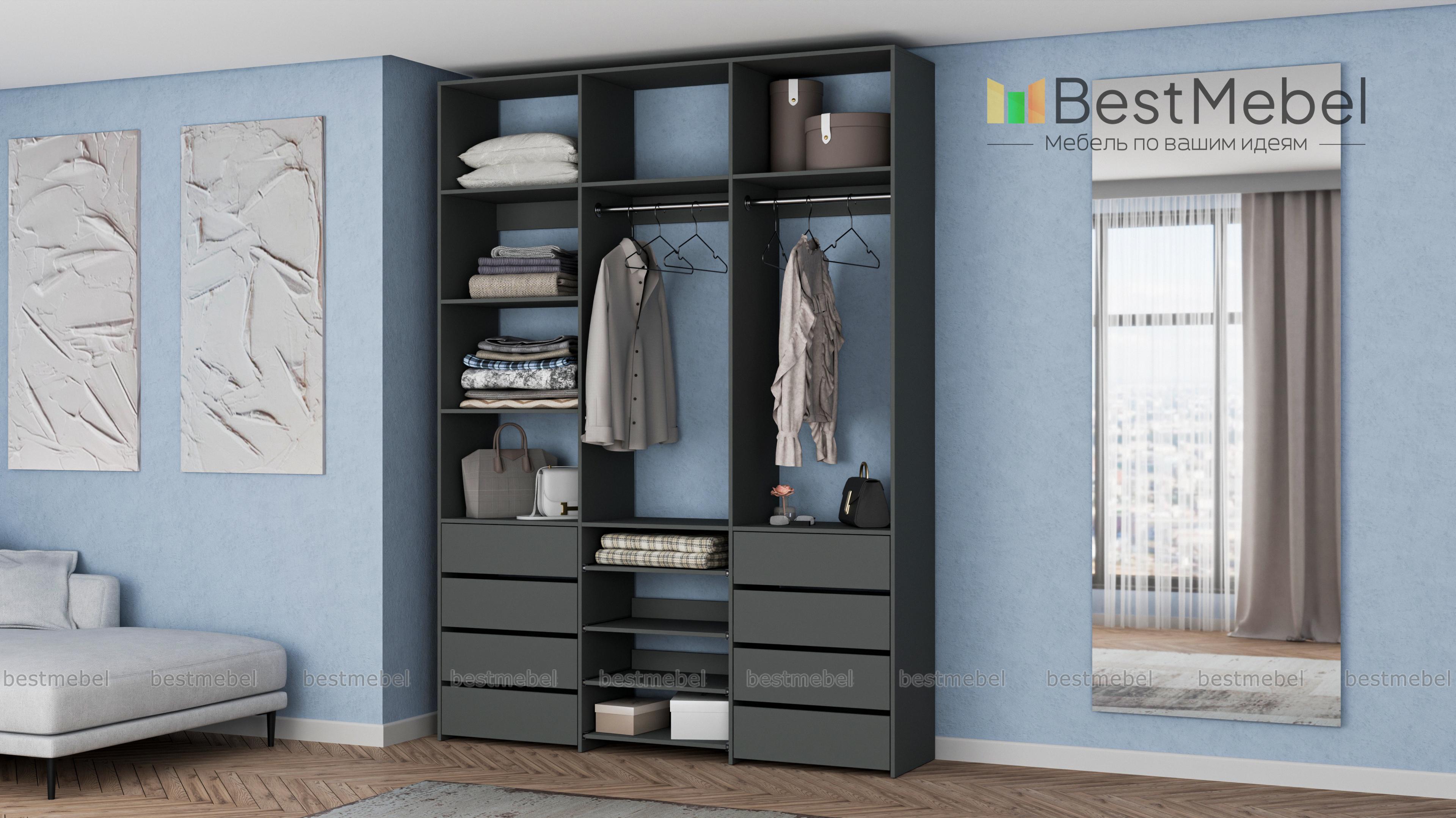 Стеллаж для одежды Мирта 97 BMS имеет открытую конструкцию и облегчит доступ к вещам. Две секции со штангами дополнены просторными полками для сложенных вещей и коробок, а в нижней части располагаются два ряда ящиков для белья и мелочей и выдвижные панели. Нейтральный древесный оттенок подходит почти к любому интерьеру, а ламинированная плита обладает прочностью и долговечностью. Купить стеллаж для одежды Мирта 97 BMS, изготовленный по вашим размерам, приглашаем в наш интернет-магазин.