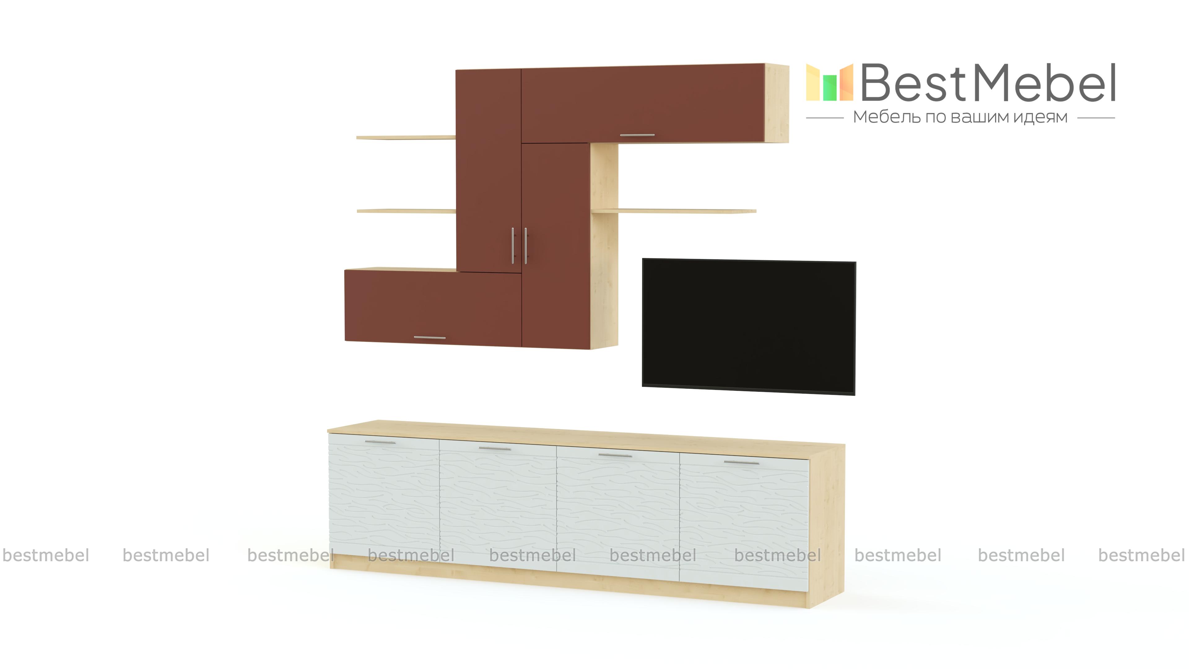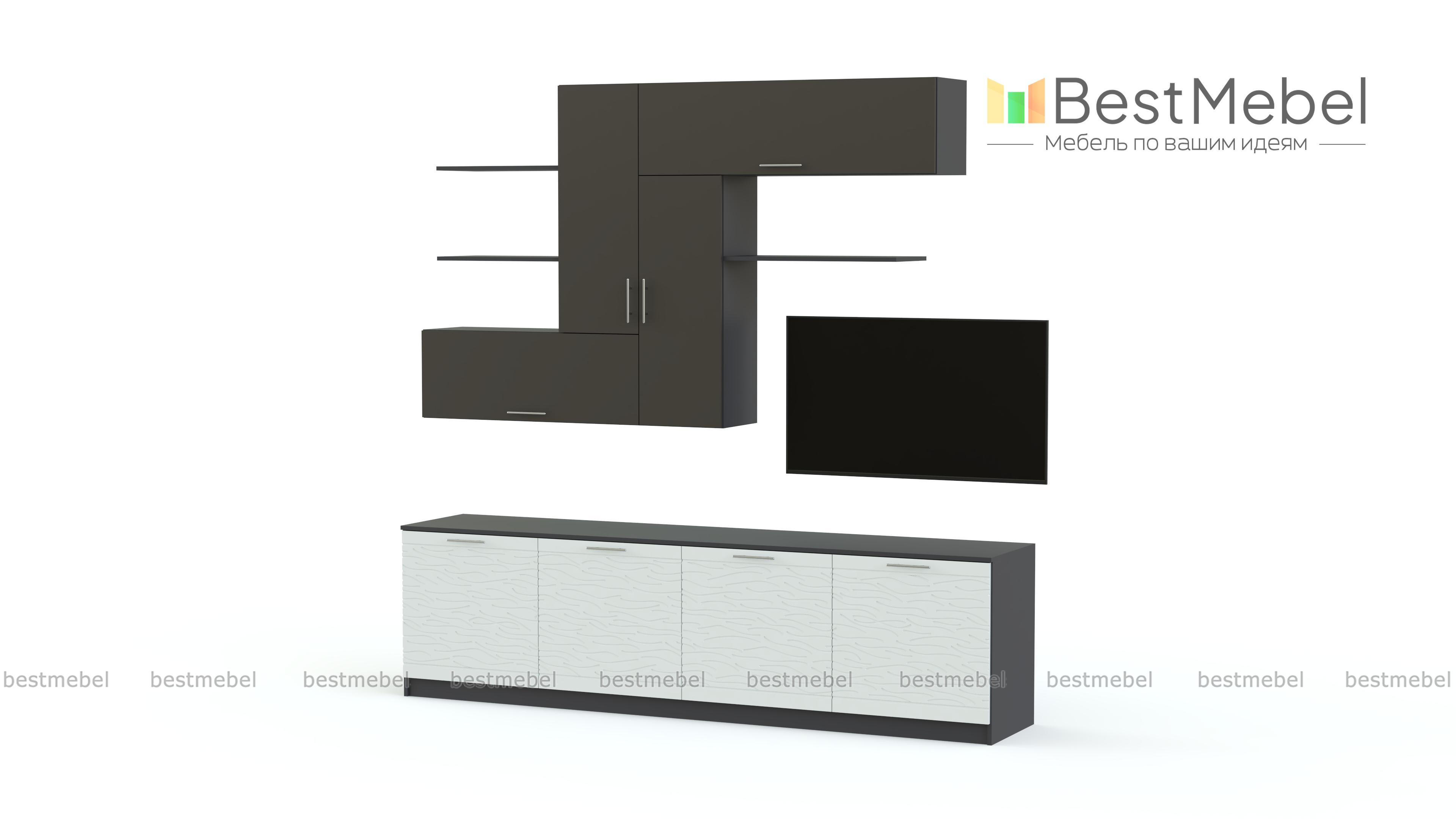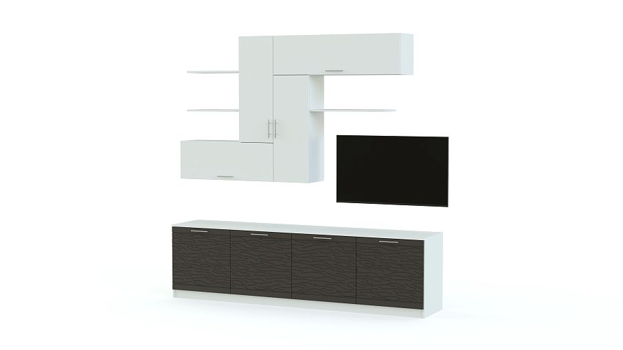 Стенка Вельвет 18 BMS станет прекрасной альтернативой громоздкой мебели в современных минималистичных интерьерах. Модель, выполненная в интересном сочетании контрастных гладких поверхностей и с фрезерованным рисунком, поможет оформить зону домашнего кинотеатра, разместить книги, предметы декора и домашние мелочи. В комплекте низкая тумба под ТВ, горизонтальные и вертикальные навесные шкафчики и открытые полки. Купить стенку Вельвет 18 BMS и сделать комнату ярче и комфортнее вам поможет наш интернет-магазин.