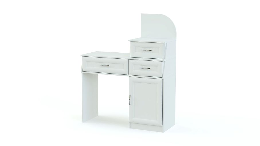 Трюмо без зеркала BMS выполнено в классическом стиле и станет незаменимым элементом меблировки спальни или прихожей. Фасады компактной модели декорированы рамками и изящными ручками-скобами, расцветка – богатая палитра оттенков на выбор. Трюмо представляет собой единую композицию из выдвижных ящиков и распашного отделения. На столешнице располагаются дополнительный выдвижной ящик для украшений и аксессуаров и открытая полочка. Купить Трюмо без зеркала BMS недорого приглашаем к нам в интернет-магазин.
