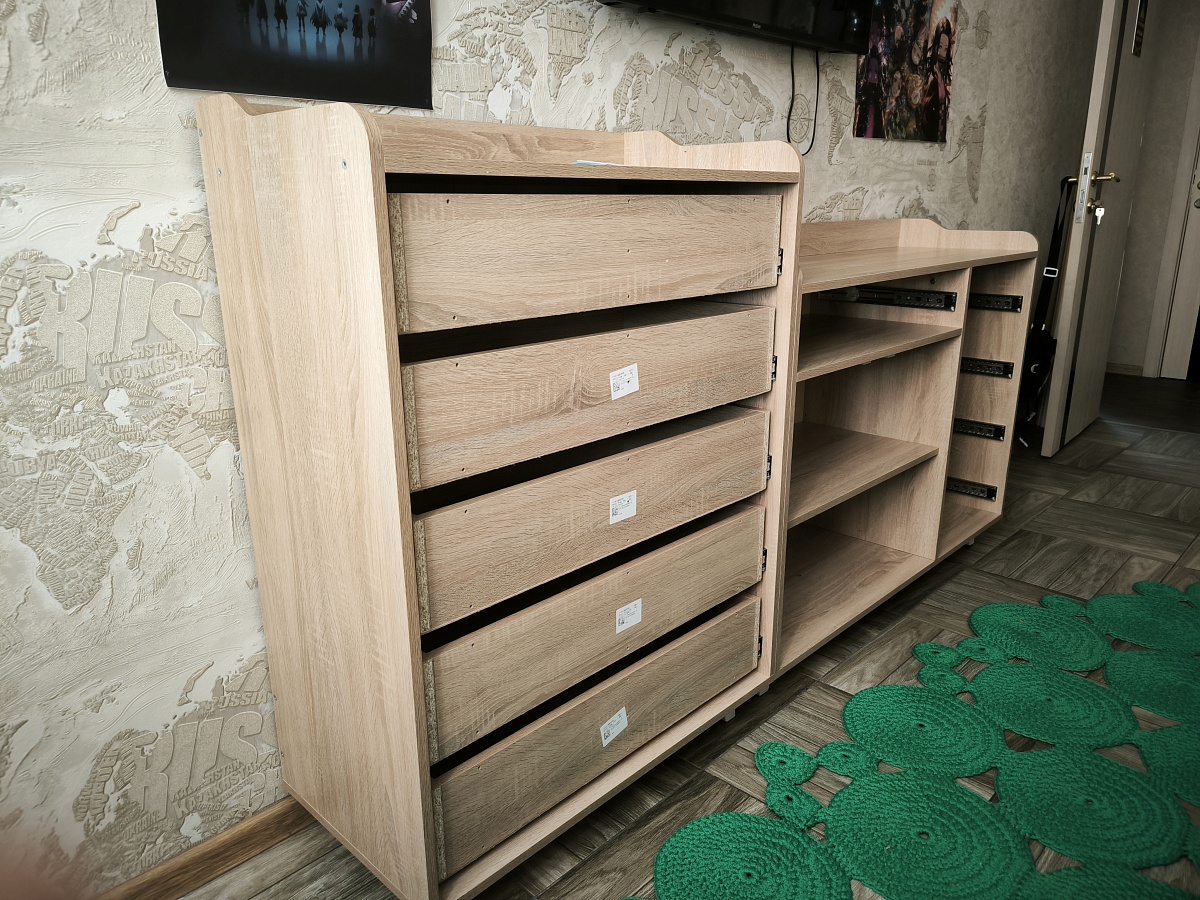 Комод отличный. Всего оба изделия - 2 метра. Конкретно мы заказали высокий комод шириной 80 см, а пониже - 1,20 м. Также дополнительно заказали секции для 2-х ящиков, и все ящики и петли с доводчиками. Комоды шикарные. Сборку брали у партнёров магазина - выше всяких похвал. Надеемся, прослужит долго.