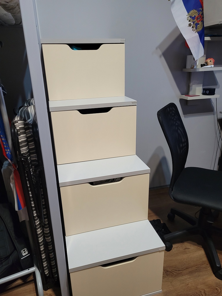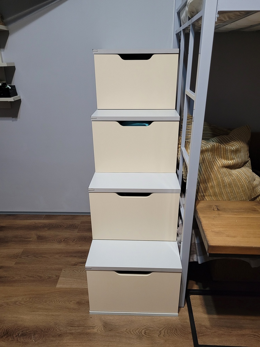Заказывала две штуки для детских кроватей-чердак. По функционалу лучше этой модели, на просторах интернета,  я не нашла. Здесь же настолько интересной мне показалась модель, что остановилась на ней. Сборка оказалась не самой простой, т.к. много ящиков надо было собрать, да ещё и умножить все старания на два. Из положительных моментов - на изготовление ушло совсем не много времени, без возрастания цены сделано усиление платформ за счёт толщины древесной плиты( у нас лестницы для подростков с 42 размером стоп и 60+ кг), все составляющие без брака и на каждой единице составляющей стоит номер, благодаря которому, весь этот конструктор хорошо собирается. Что хочется посоветовать для покупателей - заказывайте хотя бы минимальную фаску для деталей лестницы- комода, иначе заметите, какие острые края и углы будут у изделия. Мне сразу захотелось поставить силиконовые уголки. Ведь это и тактильно слишком остро и сколы могут образоваться в дальнейшем на этих тревожных местах. И производителю - может стоит добавить ещё одну ступень(ящик) с фасада. Ведь такой разбег получается большой для стандартной высоты и, соответственно, ящики тяжеловаты. Вот с торца ящики просто прекрасны. И ход вперёд у них лёгкий и задумка замечательная - столько полезного места задействовано. В целом изделие рекомендую, как и производителя.