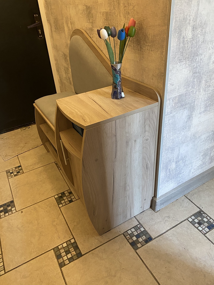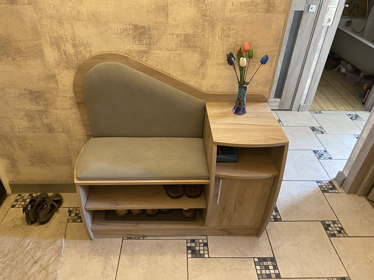 Очень красивая и удобная тумба для обуви. Выбрали цвет корпуса и обивки, а также размер, подходящие под нашу прихожую.  Все изготовили в срок, аккуратно доставили и собрали.