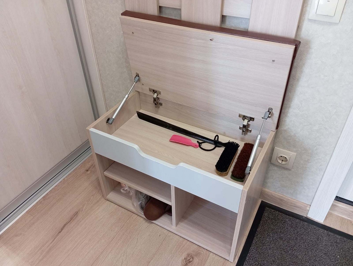 Заказ №891627 от 05.10.2023. Обувницу заказала небольшую, с нужными мне размерами в маленькую прихожую. Несмотря на компактность обувница многофункциональная. Есть и полки для обуви разной высоты, и сидение, и закрытый ящик для мелочей. Цвет Ясень Шимо Светлый/ фасад Серый/ сидение Коричневый. Покупкой довольна, рекомендую. 00000522965   Обувница Томас 1 BMS (650х500х350)