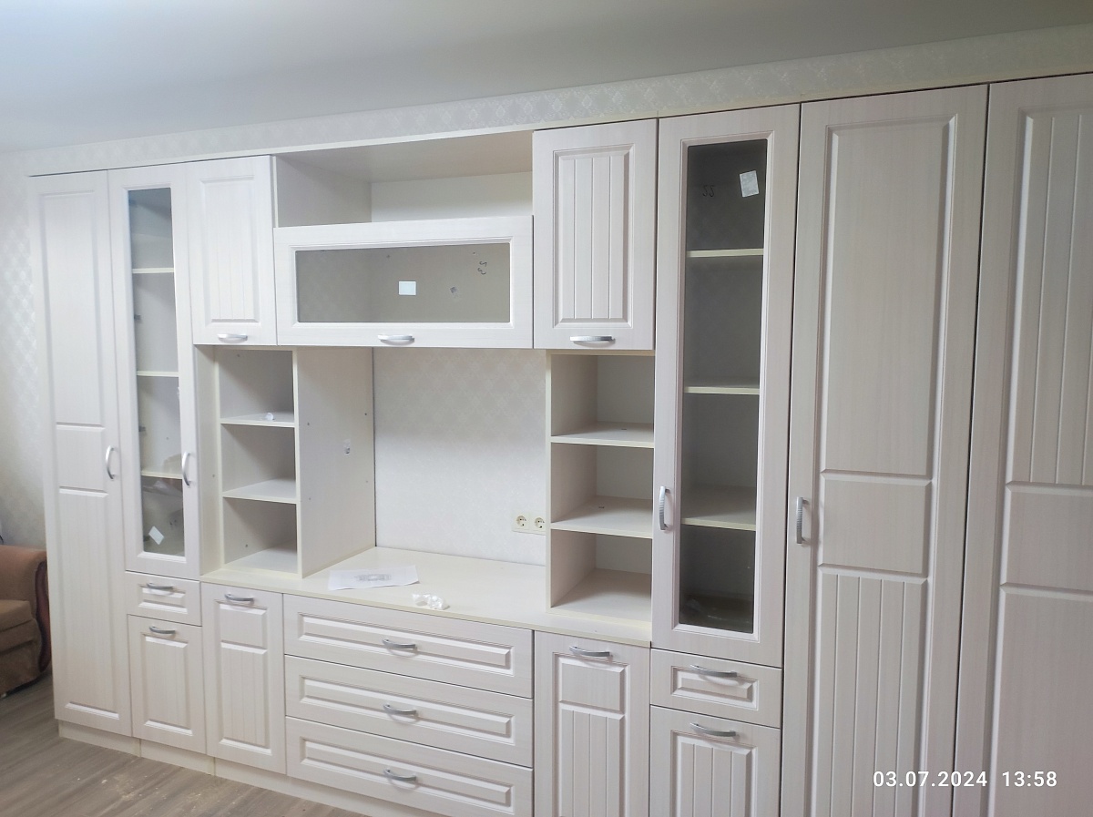 Гостиная очень пришлась по душе) Обслуживание понравилось, мы из Беларуси, волновались как что дойдёт, опасения были напрасны. Товар привезли в целости и сохранности, комплектующие все в норме. Менеджеры все объясняют, рада прекрасной обратной связи) Гостиная современная, компактная, нижние полки вместительные. Не пожалели о своём выборе. Есть некоторые нюансы: заказывали матовое стекло, пришло прозрачное, но нам оно тоже понравилось. Крепления серебряные спадают, когда дотрагиваешьяся, а так нормально висят. И полки две, которые с серебряными вставками пружинят, когда трогаешь. А так все гуд) Советую данного продавца и данную гостиную.