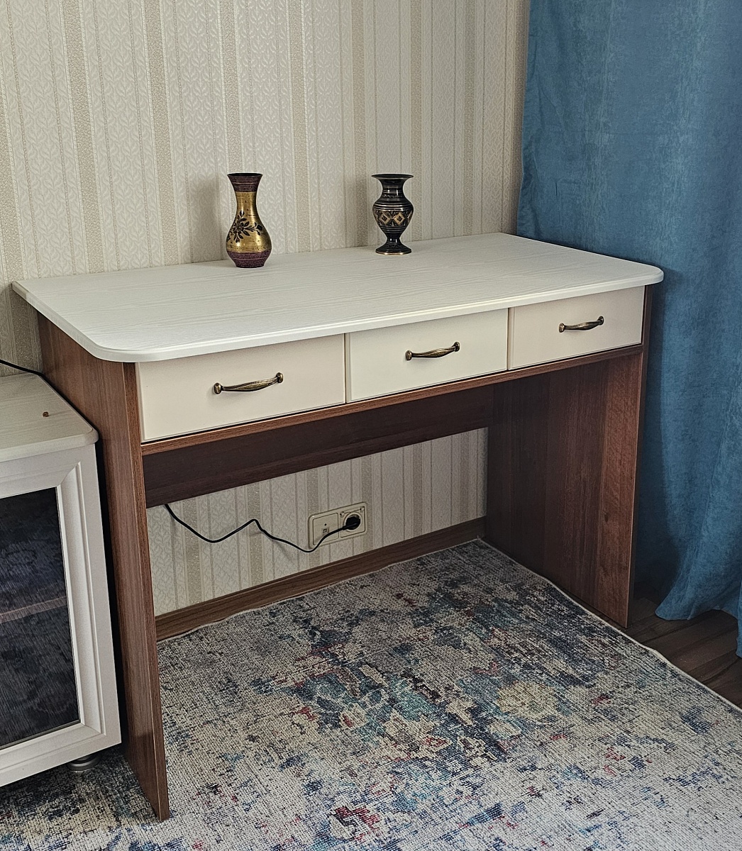 Понравилась конструкция. Заменила столешницу и фасады ящиков на мдф. Все сделали.Одно отверстие с столешнице под шкант было просверлено не там. Боковинки ящиков все сделаны на правую сторону, поэтому немножко пришлось со сборкой ящиков повозиться, чтобы перекоса не было.