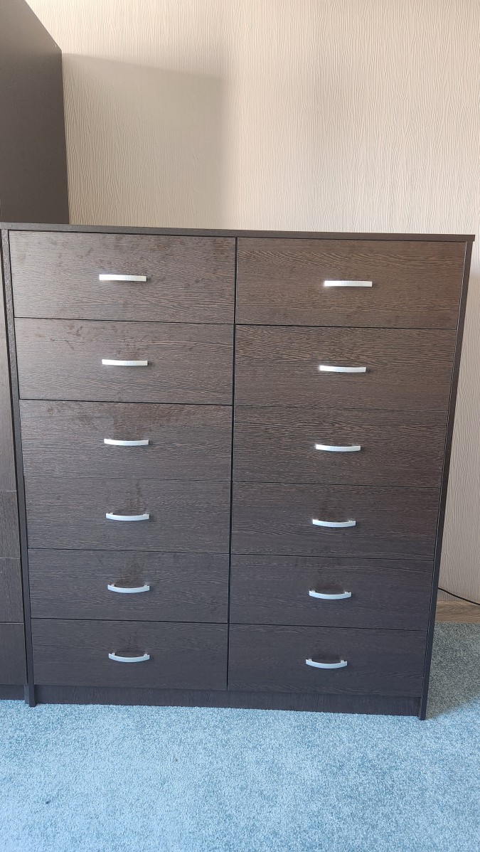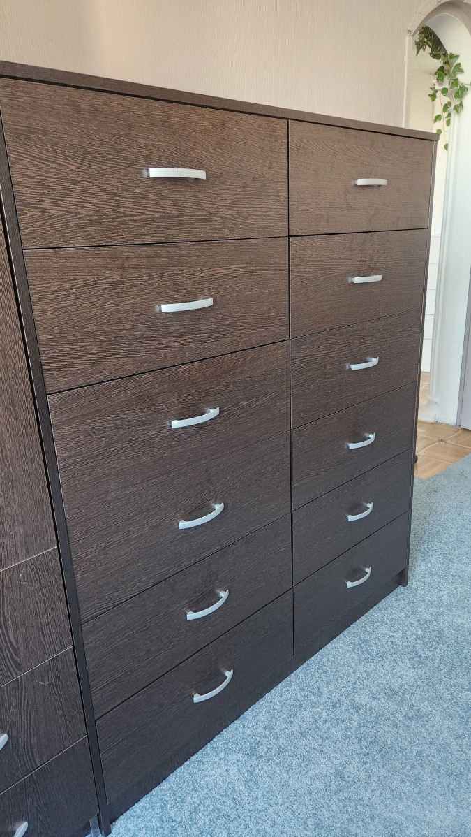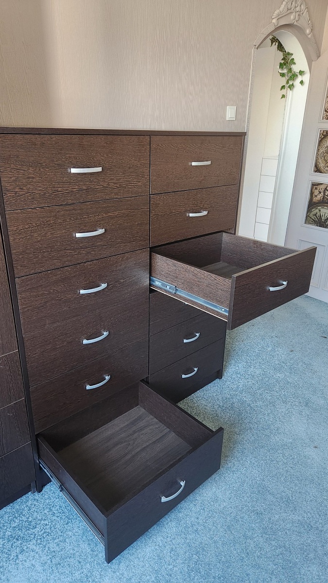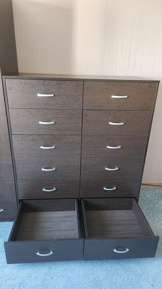 Заказ номер 00000687652. Отличный комод получился. 12 больших и удобных ящиков. И выглядит превосходно - в цвет другой мебели кроме того круто и основательно. Спасибо, сотрудникам магазина, что предложили сделать все ящики двойными - так гораздо лучше и вещи сортировать удобней. Отмечу удивительную скорость производства. Буквально еще пару дней назад согласовал проект  - и уже звонят говорят когда доставят. И это уже 6ой элемент мебели который я заказал в этом магазине!