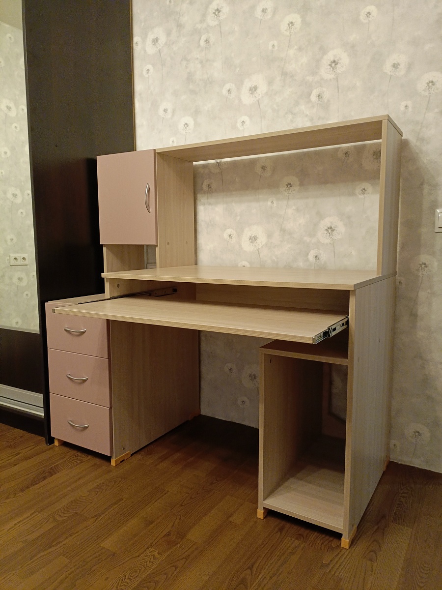 Стол понравился. Выбирал из вариантов, на полку которого можно поставить принтер и удобно им пользоваться. Заказывали с кромками 2 мм. Остальные материалы без доплаты.  Качество отличное.Собирал сам, одной стяжки обычной не хватило в комплекте , видимо, это стандарт во всех мебельных магазинах (уже был готов к такому повороту).В задней стенке места установки компьютера делал выпил для вентиляции (наверное, со сборщиком тоже можно договориться при желании).В комплекте идут пластиковые подпятники, цвет которых выбрать нельзя - это минус небольшой.