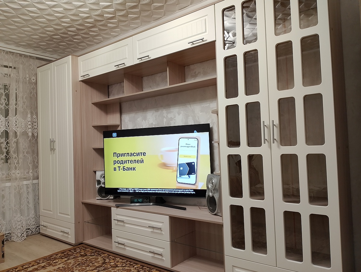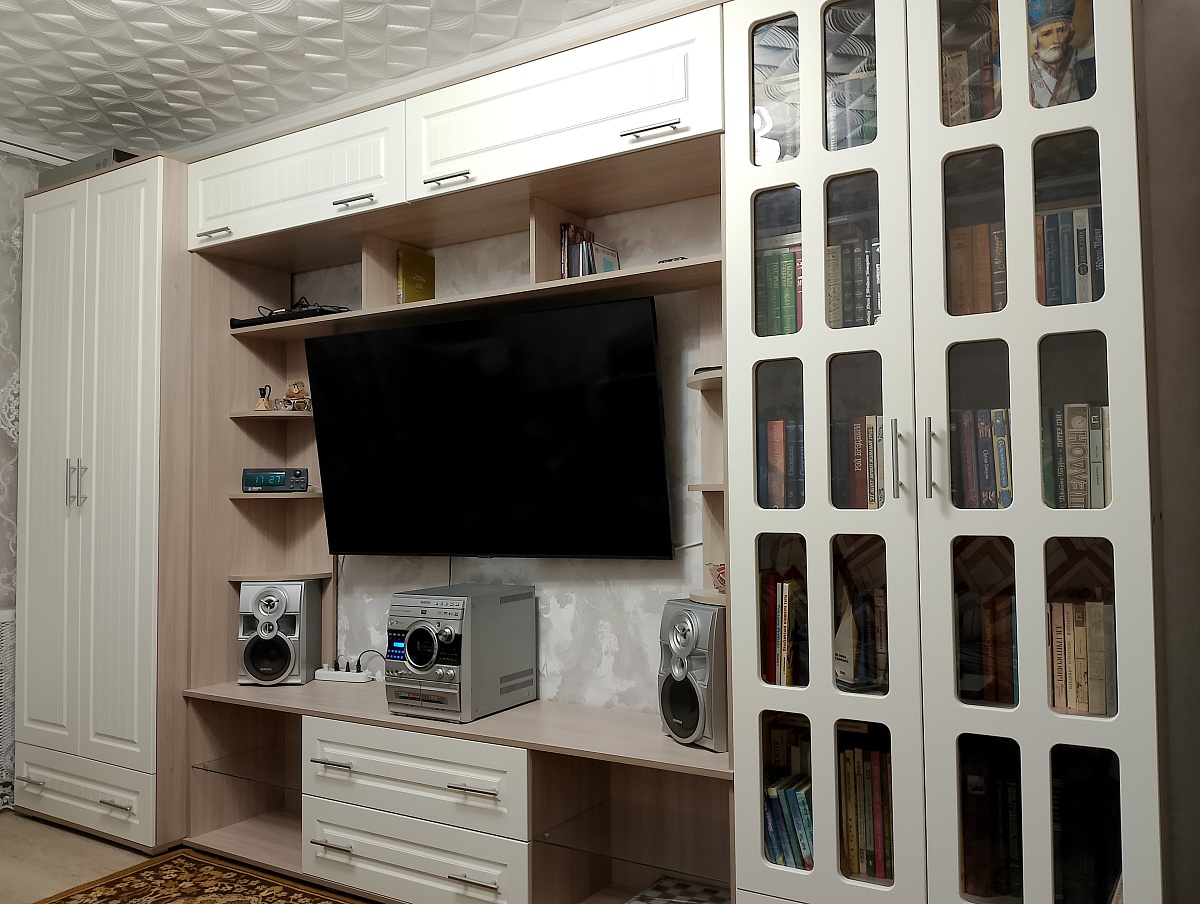 Заказ № 1216860Отличная стенка, соответствует всем моим требованиям: большая тумба под TV, шкаф для одежды и книжный шкаф. Удобно, что можно выбрать разную глубину шкафов.