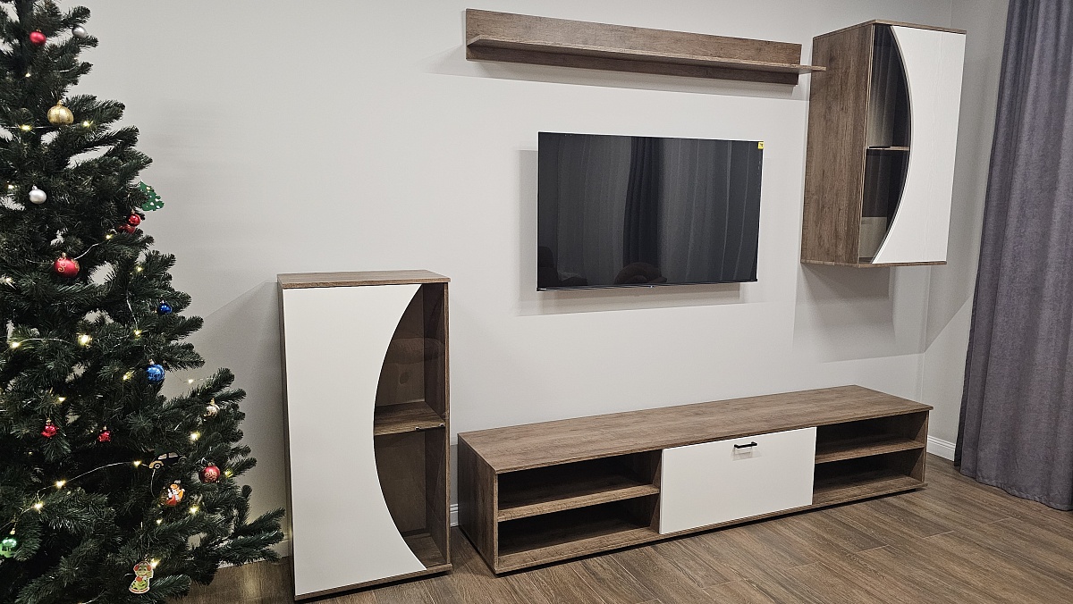 Поставил себе эту замечательную стенку в загородный дом. Целью было оформить телевизионную группу. Подобрал размеры больше стандартных, чтобы по ширине стены смотрелось гармонично.