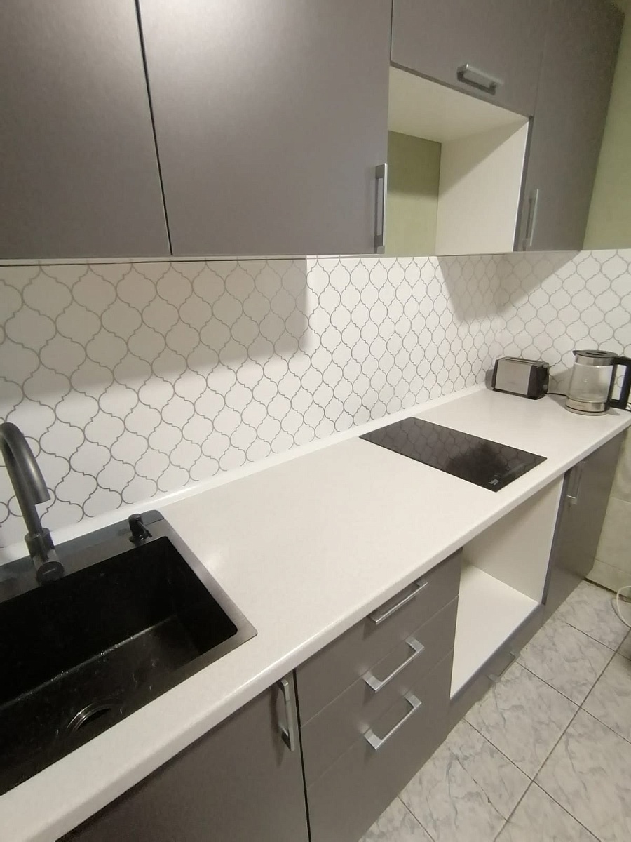 Отличная бюджетная кухня. Быстро изготовили, привезли, собрали. Были минимальные сколы внутри (это вопросы к доставке), но мне некритично. Всё работает, петли, доводчики в норме).Отзыв оставляю после 2 месячного пользования.