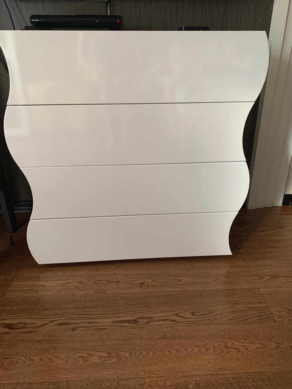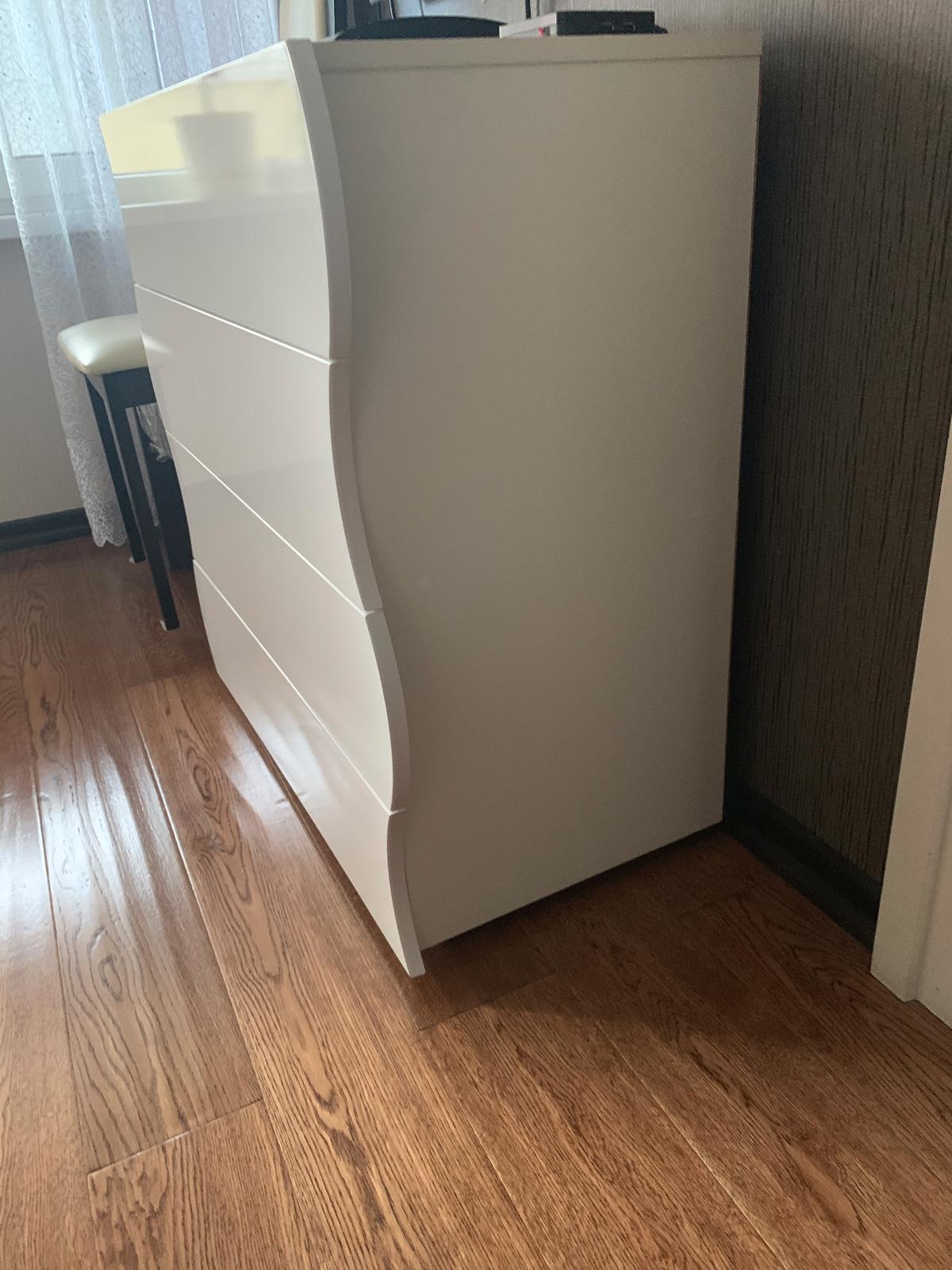 Приобретали комод в спальню, подошёл под все требования-красивый, удобный, не дорогой.Очень стильно и необычно смотрится в комнате.Белый глянец зрительно увеличивает немного пространство, довольны покупкой (Заказ №299690)