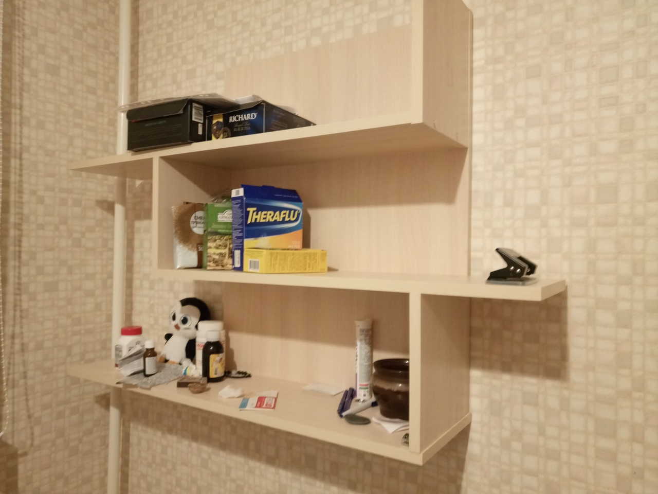 Это мега полка, очень большая и вместительная. Книги, бумаги, всякие мелкие бытовые вещи - все умещается запросто.Да и места в комнате занимается по минимуму, т.к. повесил над столом.Конструкция крепкая, собирается легко, как детский конструктор. Рекомендую.