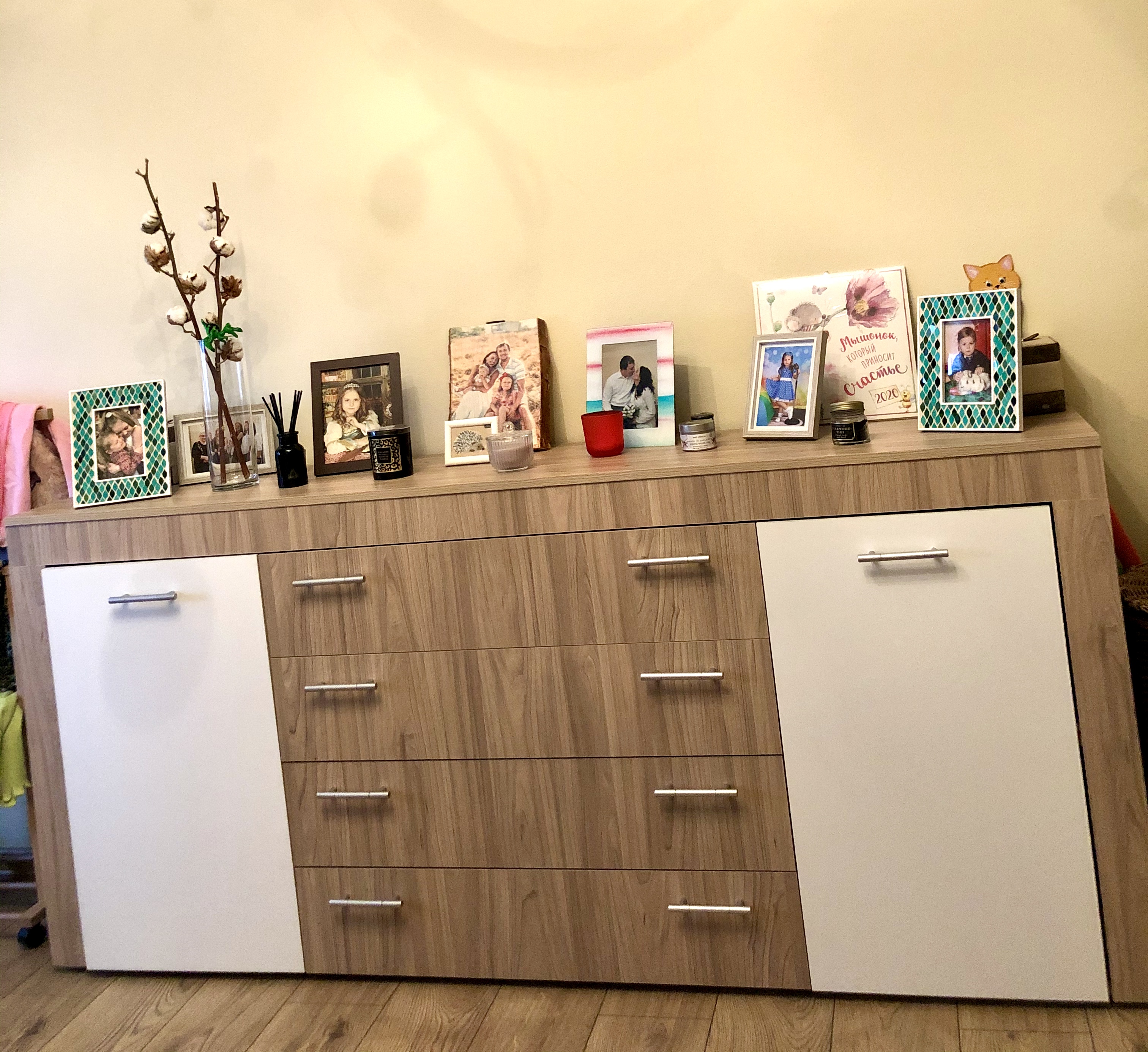 Комод отличный! Очень вместительный. И великолепно вписался в интерьер комнаты.Доказывала в него комплектующие, чтобы лучше задвигались ящики. О чем ни капельки не пожалела! Ящики достаточно длинные получились (заказывала длину комода 2 м) , и на обычных креплениях начались бы сложности...Сборщик был великолепный! Достаточно быстро собрал его, все показал и рассказал, чтобы комод прослужил дольше.Покупкой очень довольна! Рекомендую.Впредь буду еще заказывать здесь мебель.